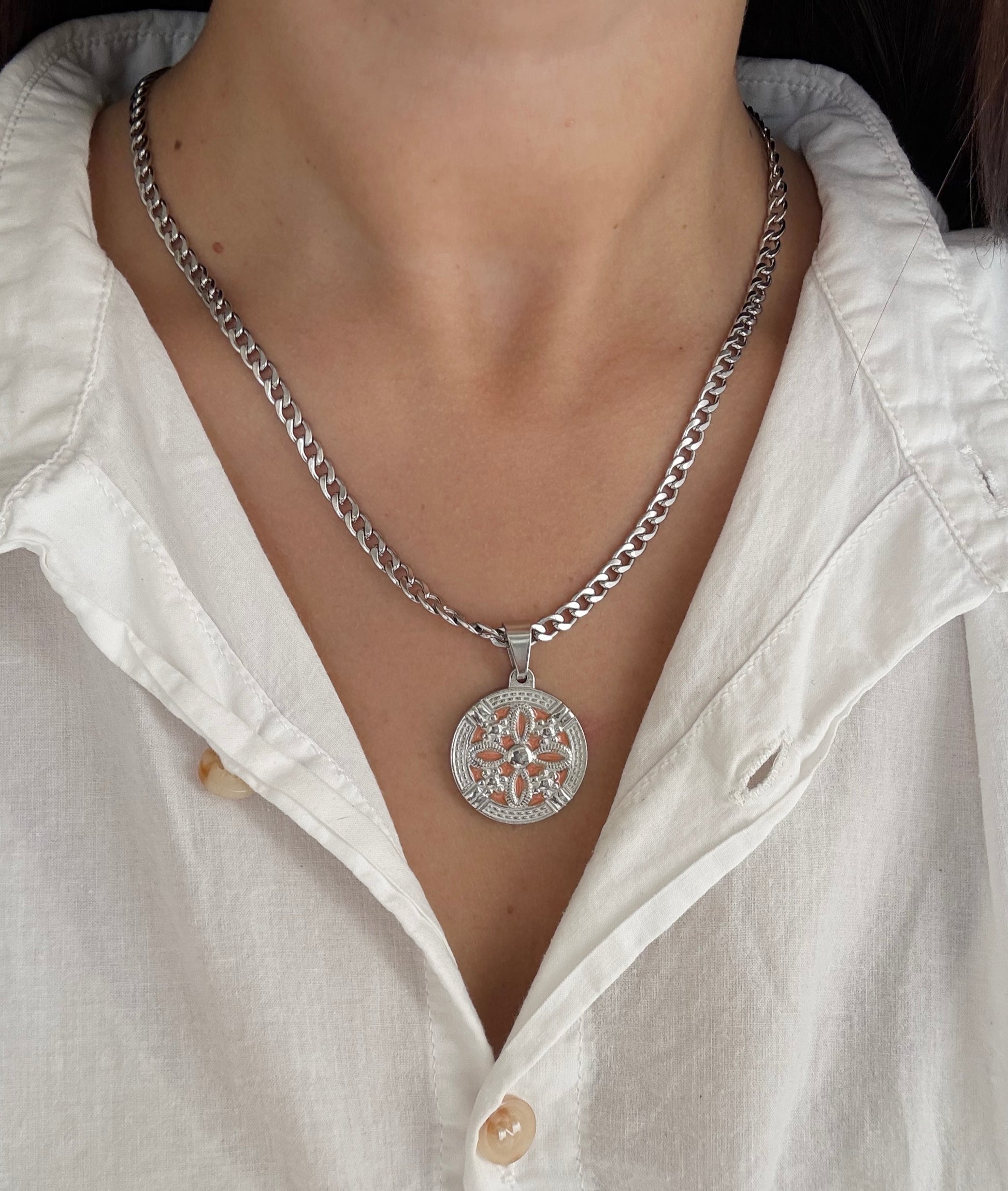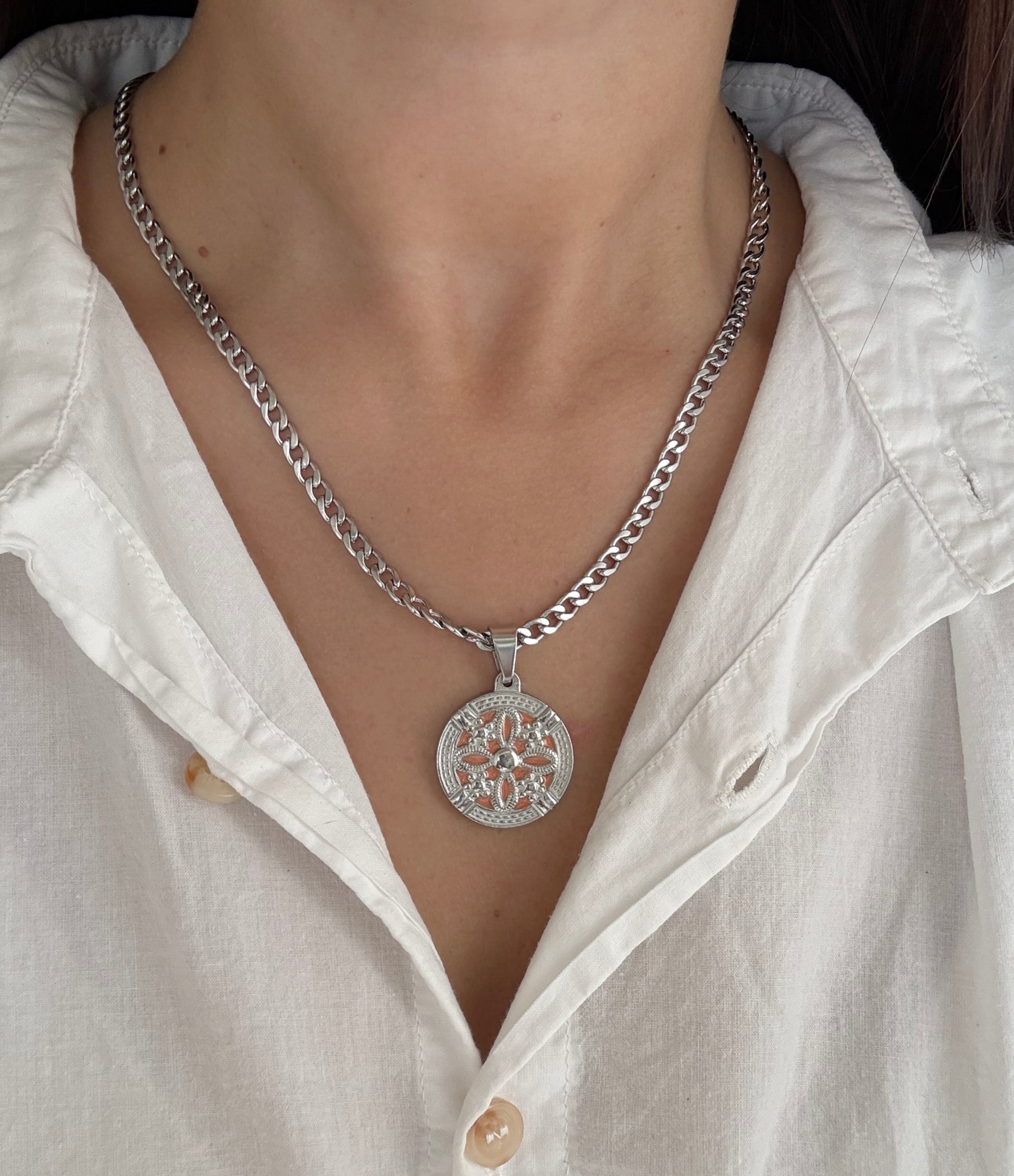 Cadena dije flor naranja acero