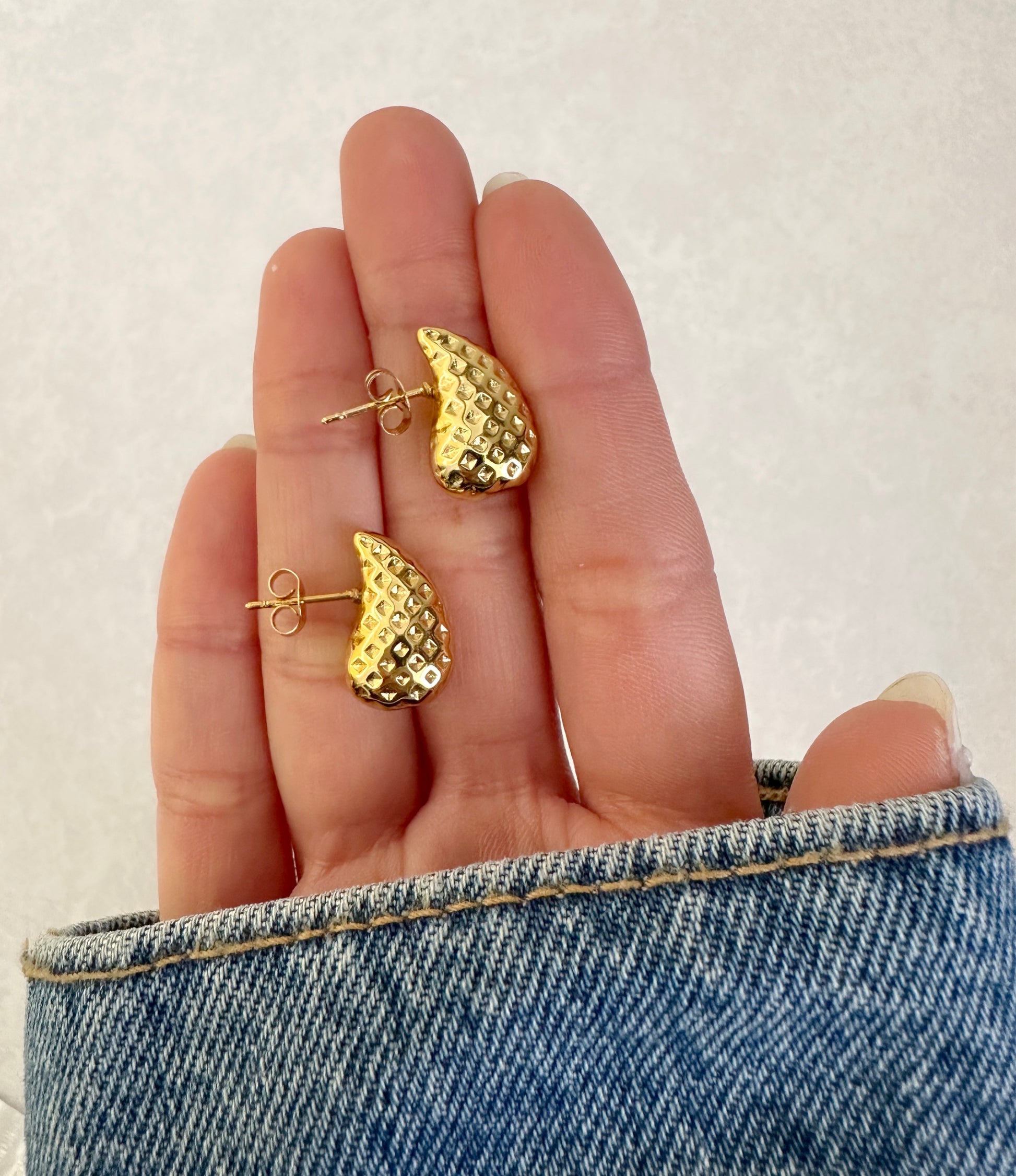 Caravanas gota acero dorado labrado puntitos